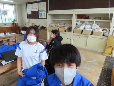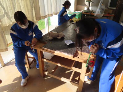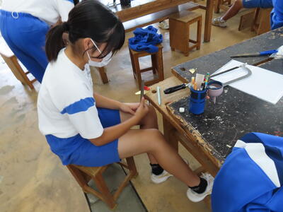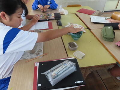 2年生の美術です。粘土を使って作品作りでした。まだ、バッグの制作をしている人もいます。