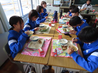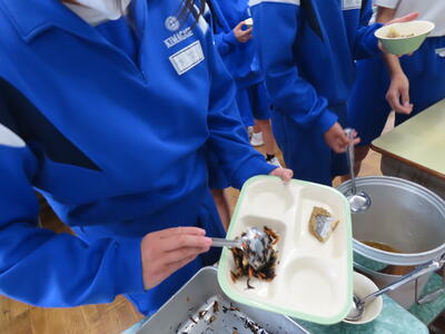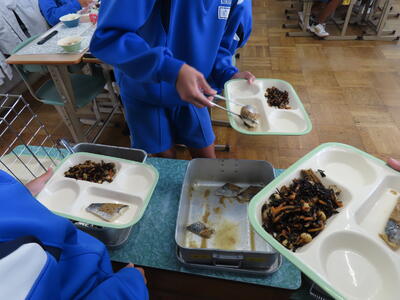 この日の献立は、~和食の日献立~で、ご飯、牛乳、さつま汁、さんまの蒲焼き、ひじきの炒り煮でした。美味しくいただきました。ご馳走様でした。