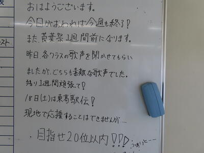 昼間は強い風が吹いて、木の葉や砂埃を舞い上げていました。でも、冷たい風ではありませんでした。8日(土)は土曜授業でしたが、部活動の大会や高校の説明会などが重なり、登校する生徒は多くありませんでした。日曜日はどのように過ごされましたか。冷たい雨が降り、気温も12月並みと寒い一日だったので、家で過ごされる方が多かったのではないでしょうか。近隣の学校ではインフルエンザが流行、という話も聞かれています。体調には十分にご注意ください。