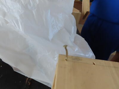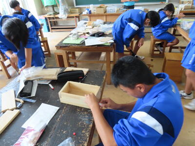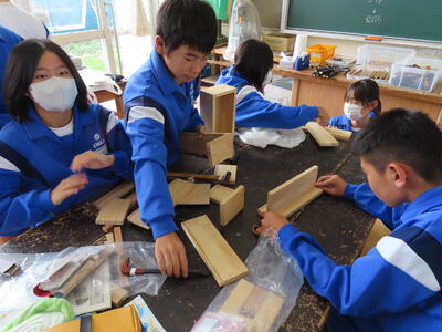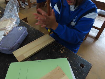 1年生の技術、木材加工です。時々、釘が曲がってしまうこともありますが、頑張っています。