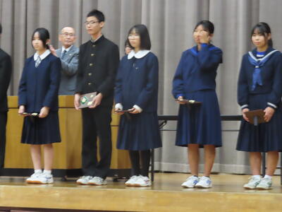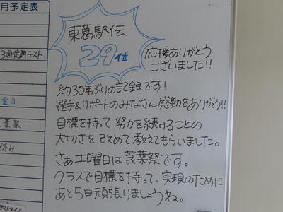 昨日は市民駅伝大会が行われ、男子が第3位、第6位に入賞。女子は入賞は果たせませんでしたが、普段の練習の成果を発揮すべく、一生懸命な走りを見せてくれました。新チームになり、最初の大会でしたが上々の滑り出しです。午後にはあおいそら運動推進大会が行われ、実践文で2名の生徒が優秀賞を受賞しました。運動面でも文化面でも生徒たちは頑張っています!!!