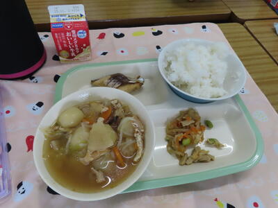 本日の献立は、ご飯、牛乳、のっぺい汁、さばのスタミナ焼き、おかか和えでした。美味しくいただきました。ご馳走様でした。