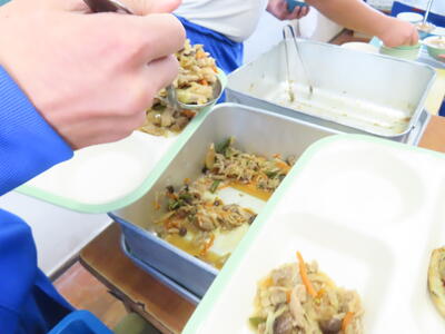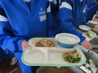 この日の献立は、発芽玄米ご飯、牛乳、野田野菜のみそ汁、炒り卵丼、こんにゃくの金平でした。美味しくいただきました。ご馳走様でした。