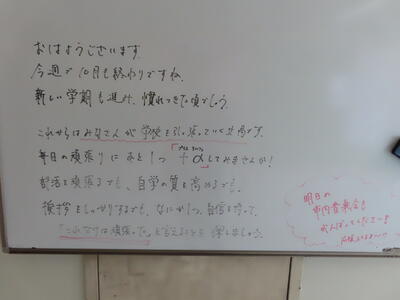 本日より教育実習が開始されました。木間ケ瀬中学校の卒業生3名が母校で後輩たちと学校生活を送ります。3週間という限られた期間ですが、お互いに刺激を受け合って、たくさんのことを得られればと考えます。どうぞご家庭でも話題にしてみてください。