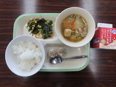 この日の献立は、ご飯、牛乳、豚肉と白菜のうま煮、ポークしゅうまい、わかめとコーンのサラダでした。美味しくいただきました。ご馳走様でした。