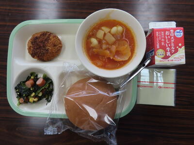 本日の献立は、丸コッペパンスライス、牛乳、イタリアンスープ、ハンバーグのトマトソースがけ、ジャーマンポテトでした。美味しくいただきました。ご馳走様でした。職員室では「それうまそげじゃないか」が炸裂していました。