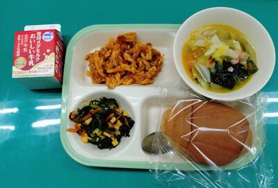 この日の献立は、テーブルロール、牛乳、白菜とベーコンのスープ、マカロニミートソース、小松菜とコーンのソテーでした。美味しくいただきました。ご馳走様でした。HP担当者は食べられませんでしたが、撮ってもらいました