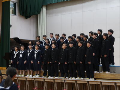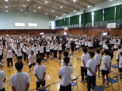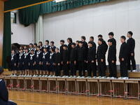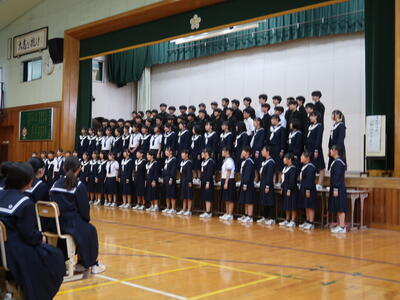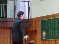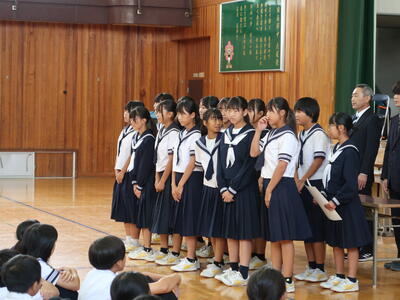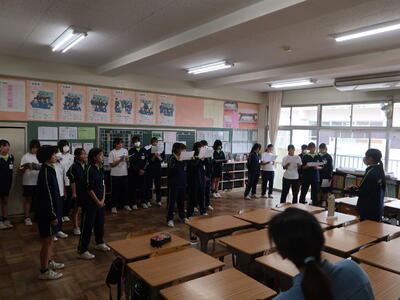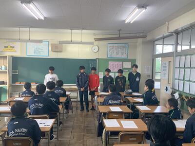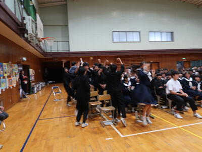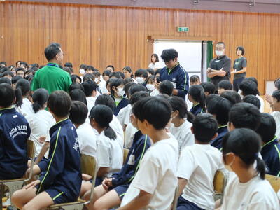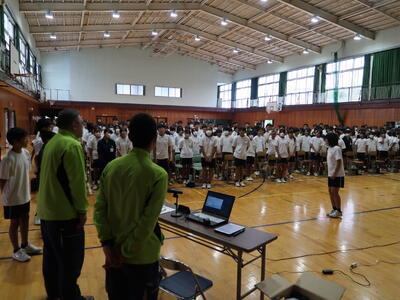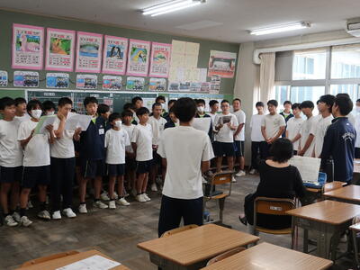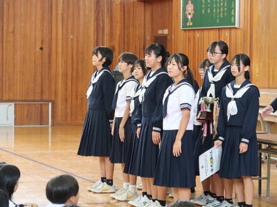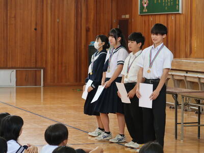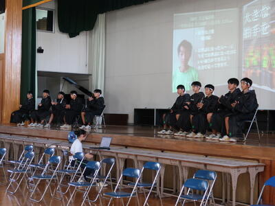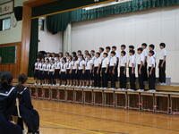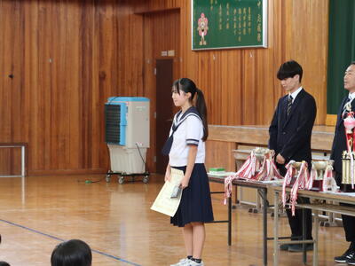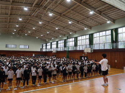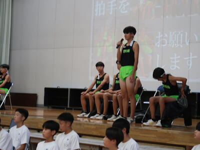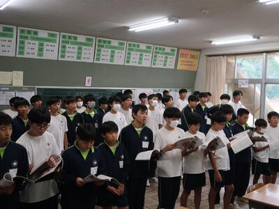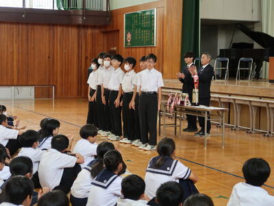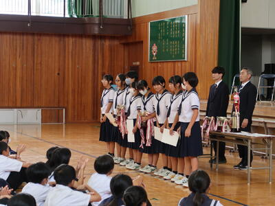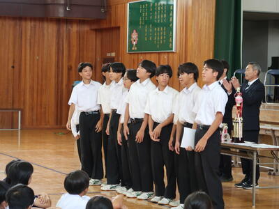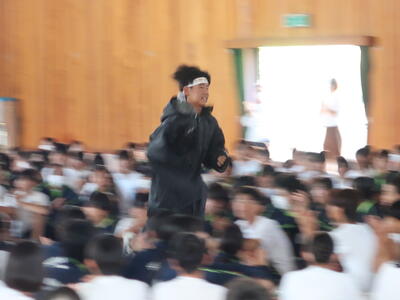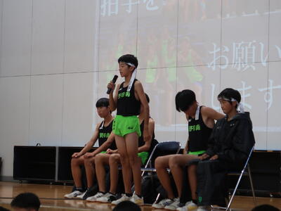 大きな返事ができる部活動が非常に多く、新チームの勢いを感じます。顧問の先生からの言葉も温かく、「日常生活でも学校に貢献できるよう頑張ります」(吉田先生)「リードされても逆転、逆転で優勝することができました。男子チームが1時間、本気の応援をしてくれたお陰です」(高橋先生)