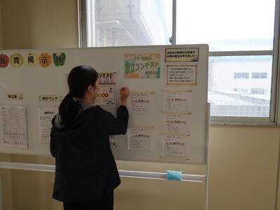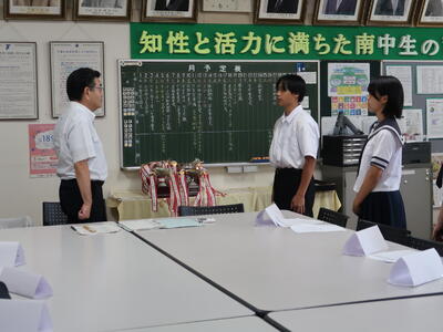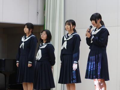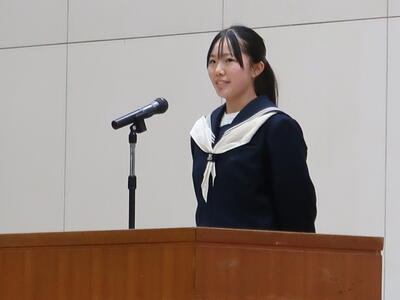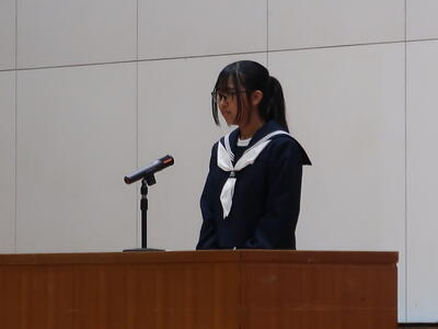 2年生、松田さん「評議委員としての経験が自分を大きく成長させてくれました。自分に積極性が出てきて、他の委員会を手伝えるようになってきました。これからも学年の団結力を高めていきたいです。「行動」することが人を成長させます。学年目標の「挑戦」を大切に自分も様々なことに挑戦していきたいです」
