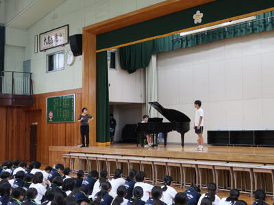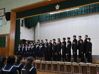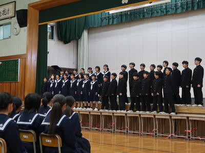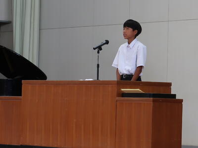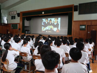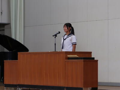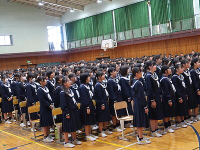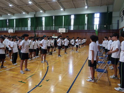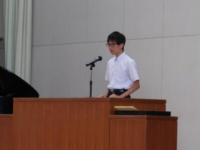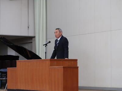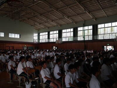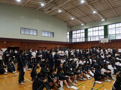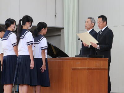 校長先生からはノーベル化学を受賞した北川進京都大学特別教授の逸話から「感謝の大切さ」について話がありました。「感謝の心を持つと、ストレスや体力の回復につながります。前期の頑張りを讃えながら、自分を支えてくださった方々に感謝の気持ちを持ちましょう。また、制服には着方が決まっています。節目節目で着る制服の着方を大切にしましょう」