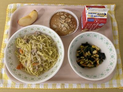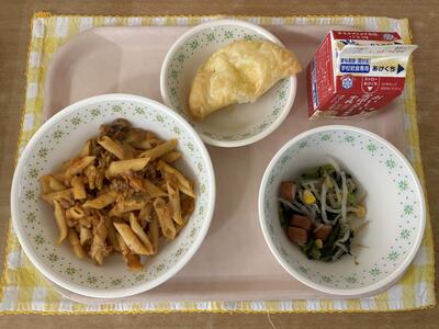 副菜は、彩り豊かな「小松菜とウィンナーのソテー」です。小松菜やもやし、コーンにウィンナーの旨味が加わり、野菜が苦手なお子さんでも箸が進む味付けになっています。 デザートには、口当たりさっぱりのフルーツポンチがつきました。 栄養満点の給食をしっかり食べて、午後も元気に過ごしてほしいと思います。