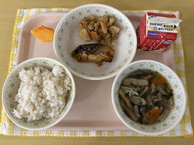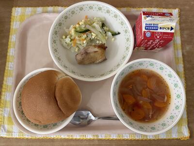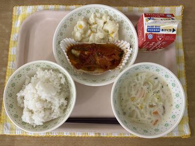 今日のメニューは「白身魚のトマトソースがけ」「コーンポテト」「白菜のミルクスープ」です。今日の白身魚は銀ダラです。これには目の健康を保つ「ビタミンA」が含まれています。明日は10月10日「目の愛護デー」です。日頃酷使しがちな目を労るようにしてほしいです。
