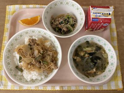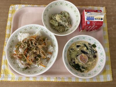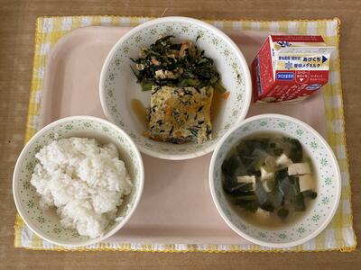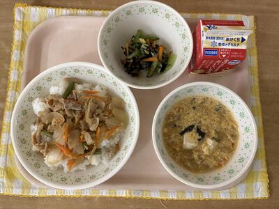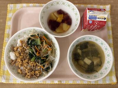 昨日の給食をご紹介します。 今日の献立は、**「そぼろ丼」「小松菜の梅じゃこ和え」「根菜の味噌汁」「牛乳」**です。