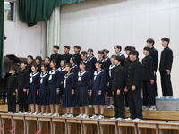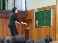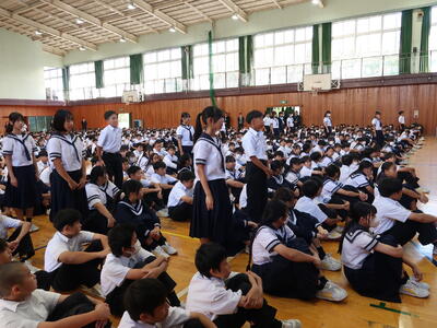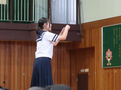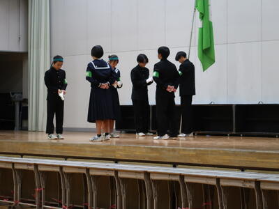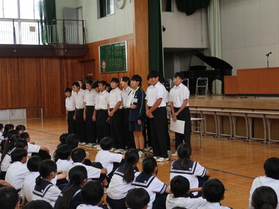 今回の集会は、清掃活動への意識向上を最大のテーマとして開催されました。前半では清掃委員の代表者から普段の清掃への取り組みに関する発表があり、続いて2年生の北澄さんより地域清掃についての報告が行われました。