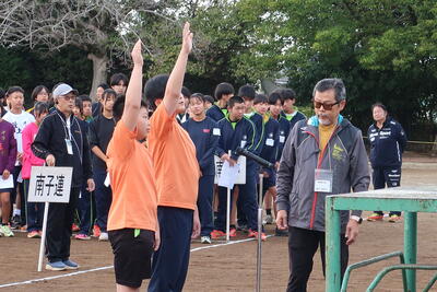 1区1年生金盛君、エース区間で見事な走り!3000mに換算すると9分30秒相当に値する走りでトップと3秒差の2位。ライバル第一中、木間ヶ瀬中と接戦です。2区はAチームデビューの1年生洞毛君、スピードランナーが揃う2区で区間5位で3位を死守!3区1年生淺村君、区間2位に30秒近く差をつける区間賞でトップに躍り出ると…。4区1年生藤﨑君が第一中の大エースの猛追をうけながらもトップを死守!5区Aチームデビュー戦の1年生宇敷君が見事区間賞!ここまで1年生5人でタスキをつなぎ、トップを快走。アンカーは今季大きく成長した頼れる先輩、重堂君。優勝に花を添える区間賞で、見事、男子チームが栄光を手にしました。