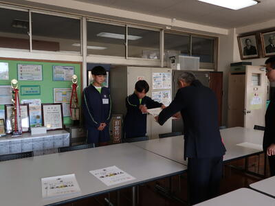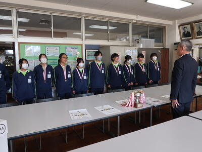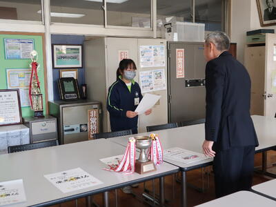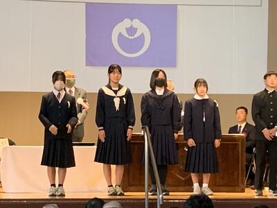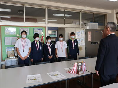 女子ソフトテニス部、女子卓球部、特設駅伝部、男子バレーボール部、女子バレーボール部、剣道部が表彰されました。今週の土日に県大会がある、男子バレーボール部、女子バレーボール部、剣道部の皆さん、頑張ってきてください。また駅伝部は関東大会に出場です。そちらに向かっても頑張ってほしいと思います。