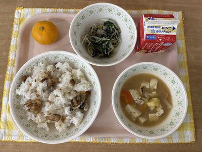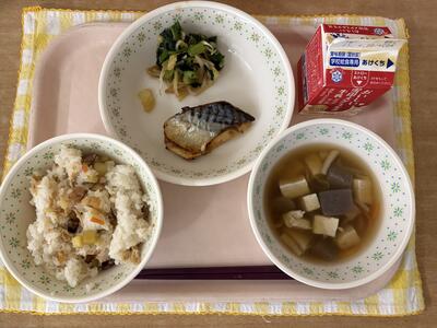 今日のメニューは「吹き寄せご飯」「さばの塩焼き」「おひたし」「いものこ汁」でした。今日の主食は秋の味覚メニュー「吹き寄せご飯」です。吹き寄せご飯とは、木の葉が風で吹き寄せられるような彩りを表したご飯です。ご飯の具は、鶏肉、さつまいも、にんじん、しいたけ、油揚げでした。とても美味しくいただきました。