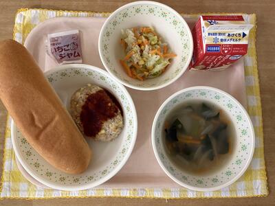 今日の給食は「旅する昼ごはん ドイツ編」です。メニューは「ライ麦パン」「ハンブルグステーキ」「クラウトザラート」「クヌーデルスープ」「イチゴジャム」でした。