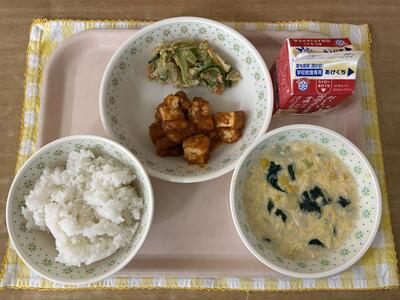 汁物の「五目スープ」は、具だくさんで満足感のある一品です。中には子どもたちに大人気のウズラの卵が入っており、見つけると少し幸せな気持ちになります。さらに、タケノコの「シャキシャキ」とした歯ごたえが心地よいリズムを生んでいました。