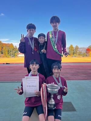 1区1年生金盛君、エース区間で見事な走り!3000mに換算すると9分30秒相当に値する走りでトップと3秒差の2位。ライバル第一中、木間ヶ瀬中と接戦です。2区はAチームデビューの1年生洞毛君、スピードランナーが揃う2区で区間5位で3位を死守!3区1年生淺村君、区間2位に30秒近く差をつける区間賞でトップに躍り出ると…。4区1年生藤﨑君が第一中の大エースの猛追をうけながらもトップを死守!5区Aチームデビュー戦の1年生宇敷君が見事区間賞!ここまで1年生5人でタスキをつなぎ、トップを快走。アンカーは今季大きく成長した頼れる先輩、重堂君。優勝に花を添える区間賞で、見事、男子チームが栄光を手にしました。