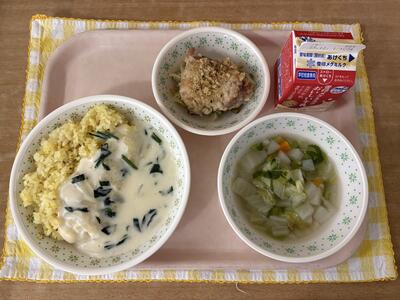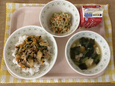 昨日の給食をご紹介します。 今日の献立は、**「そぼろ丼」「小松菜の梅じゃこ和え」「根菜の味噌汁」「牛乳」**です。