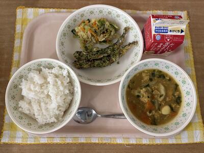 メインの「ししゃも」は、頭から尻尾まで丸ごと食べられるため、成長期に大切なカルシウムをしっかりと摂ることができました。カリッと香ばしく揚げたししゃもに、特製のピリ辛ソースがよく絡み、白いご飯も進む味付けでした。