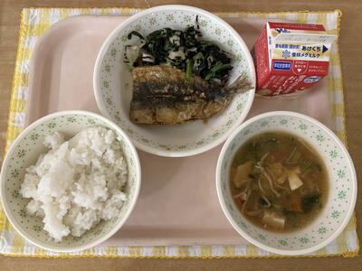 今日のメニューは「サンマご飯」「白菜のごま油和え」「さつま汁」「ミカン」でした!