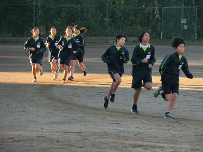 7時集合前にウォーミングアップをしている生徒。そうです、大会前日は千葉県新人駅伝競走大会0区が行われます。0区に込められた想いとは。大会には出場しませんが、「心は共に」、走りで選手にエネルギーを与えるという意味です。
