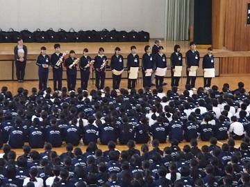 10月6日(金)は前期最終日です。生徒集会があり、「挨拶」と「気づき掃除」について、全校生徒で高めようとする発表がありました。また、生徒集会を運営してきた現3年生の評議委員がステージで全校生徒にお礼を伝えました。次回からは、2年生の評議委員が生徒集会の運営を行います。最後に鈴木校長先生から後期に向けてお話しがありました。内容は、①各大会、各コンクールで素晴らしい結果を出している。みんなの頑張りが素晴らしい。②学校生活を向上させよう。学校外も「あいさつ」等を実践しよう。中学生として一流を目指してほしい。③通知表で前期を振り返り、後期の目標を考えてほしい。と伝えました。