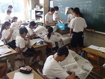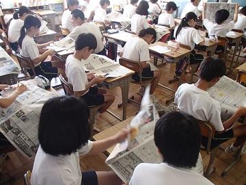 2年生は、8時過ぎからNIE学習に取り組んでいます。廊下を歩いていると、新聞を広げる「ざわざわ!ざわざわ!」という心地よい音が廊下に響きます。昔は各家庭でよくある光景の一つでした。政治、経済、芸能、スポーツなど多くの記事から注目の情報を取り上げ、要約、感想等を書き込んでいきます。