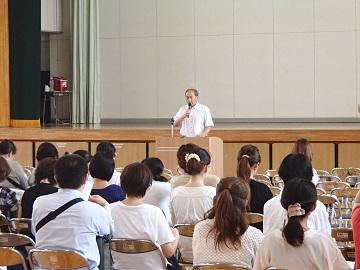 ⑥養護教諭 末永先生の話;夏季休業中の熱中症予防について、資料をもとに説明がありました。