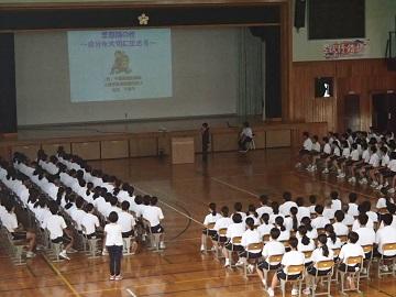 (3学年全体で講演を聞きました。暑い体育館でしたが、静かに講演を聞きました。)