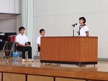 1年生代表 宮田丈一郎さん:校外学習で学年が成長できたこと、学校生活では、自分の役割を意識できたことで、個の意識が集団を高める機会になった。次を考えた行動をとりたいと7月までを振り返りました。