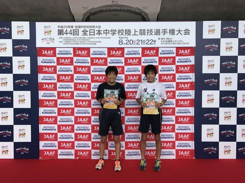 駅伝部女子2名の新野さんと山本さんは、熊本県で開催された全日本中学校総合体育大会陸上競技の部に出場しました。女子800mに出場し、新野さんは、組3位(2分16秒41)、山本さんは、組4位(2分15秒58)で健闘しました。準決勝進出24名を決める予選でしたが、全国大会のレベルの高さを痛感し、準決勝進出はかないませんでした。応援いただきました地域の皆様、保護者の皆様、ありがとうございました。