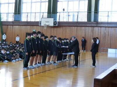 本日の4時間目、部活動の表彰集会が行われました。司会は新生徒会の副会長、野村君です。「これから表彰集会を始めます。血のにじむような努力をして、その成果が表れるのが、大会の結果です。仲間の活躍を認め、讃えられるような集会にしましょう」と野村君から冒頭に話がありました。