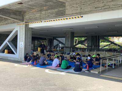 増田先生のもと、ストレッチとミニミーティング。「先に終わった後片付けや声掛けを率先して行うこと」。チームとして厚みを増すための会話がなされていました。