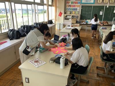 夏休みの校舎三階は文化的な香りがします。創作活動部がかわいらしい装飾品を作っていました。そうです、南部中のシンボル、「うめまる君」をつくってくれてました。今回はちょっと大きめ!完成がとても楽しみです。東葛飾地方家庭科、技術作品展に向けての作品作りについても、大変意欲的な雰囲気でした。大変アットホームな雰囲気の部活動でした。