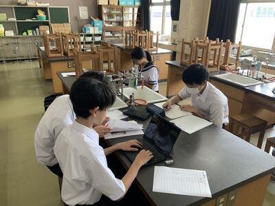 アットホームな雰囲気から、引き締まった雰囲気の部屋に…。科学部は、理科作品展の相互チェックをする日のようです。最後の仕上げに向けて、村越先生の鋭いアドバイスが入ります。合間にインタビューをしてみると、大変面白い話がきけました。「三大流星群のひとつで、年間でも常に1・2を争う流星数ペルセウス座流星群について」、「熱いお湯が冷たい水よりも早く凍る現象」、「30m飛ぶ紙飛行機」、「カメラボックスの制作」など、ロマンチックな話から科学的な追求の話まで、理科好きな生徒が自らの課題に取り組んでいました。