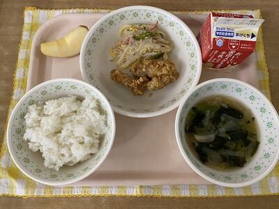 主食:ご飯 主菜:からあげ 副菜:春雨サラダ 汁物:玉ねぎとほうれん草の味噌汁 デザート:りんご
