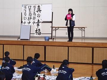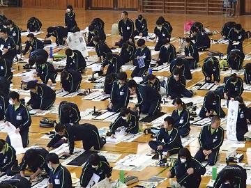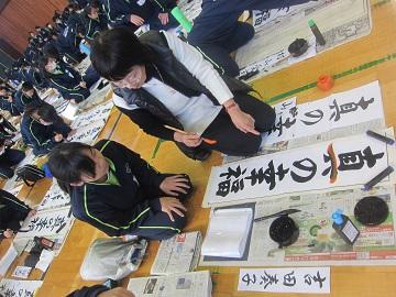 本日、午前中に1、2年生を対象に講師の米田様をお招きして、校内席書大会が行われました。1,2年生とも速やかに準備ができ、米田様の指導を受けることができました。学年によって課題は異なりますが、筆の使い方等、注意すれば短時間で改善できる点など、アドバイスをいただきました。最後に「書道には、集中力が必要です。この集中力は書道だけではなく、他の場面でも十分に役立ちます。」とお話しいただきました。席書会の様子をご覧ください。