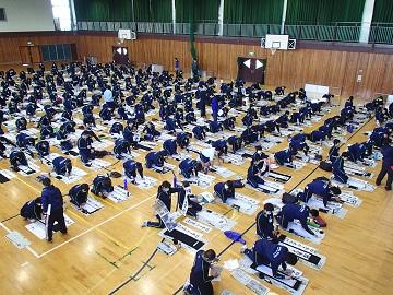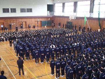 冬季休業前集会後、1,2年生は3年生の方に向きを変え、これから進路決定に向かう3年生を激励しました。現在、3年生は出願事務に関わる生徒が多く、担任と出願出願書類の確認を行っています。代表生徒から「激励の言葉」、「全校応援」、「3年生代表生徒の言葉」、「進路指導主任の話)、「校長先生のお話」と会が進みました。3年生だけでなく、全校体制での応援という雰囲気を強く感じました。今日から始まる冬休みに、3年生は自分の進路を開拓するために頑張っていきます。