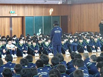 本日、体育館にて「冬季休業前集会」を行いました。内容は、①1年を振り返って ②全校合唱「ふるさと」 ③吹奏楽部全国大会報告 ④生徒指導主任の話 でした。