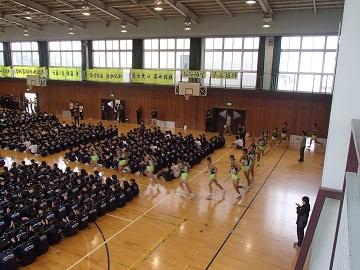 (体育館後方では、吹奏楽部の演奏に手拍子を送り、演奏を盛り上げました。反対側では、男子生徒も手拍子で盛り上げました。)