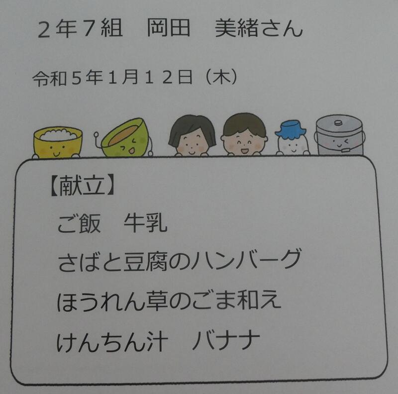 本日の給食は、2年生の家庭科の授業で7組 岡田 美緒 さんが考えたメニューが提供されました。そのメニューがこちらです。