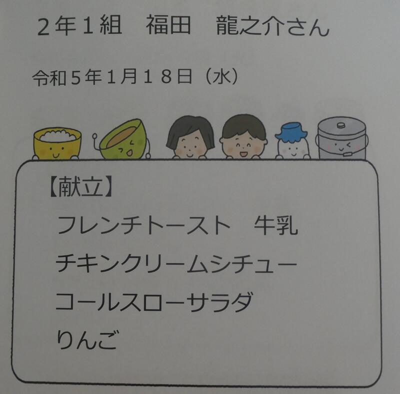 先日お知らせしましたが、本日の給食も2年生の家庭科の授業で1組 福田 龍之介 さんが考えたメニューが提供されました。そのメニューがこちらです。
