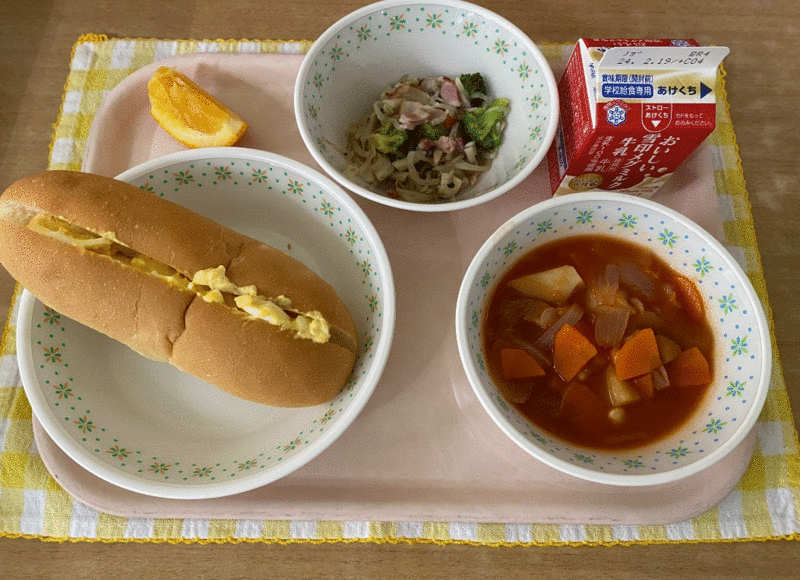 たまごサンドイッチ 牛乳 ベジタブルソテー ミネストローネ いよかん