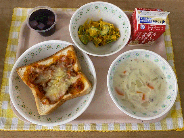 ・ピザトースト ・牛乳 ・かぼちゃのサラダ ・シーフードシチュー ・ぶどうゼリー