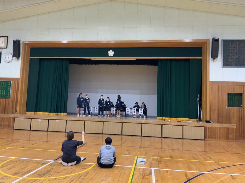 まずは委員会発表。寸劇を交えて南部中の1日の生活がわかりやすいよう、各委員会が躍動!和やかな空気で歓迎会を盛り上げます。(このシナリオは誰が作ったのかなー?)