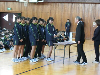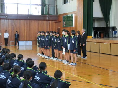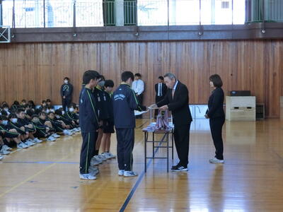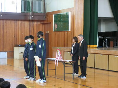 本日の4時間目、部活動の表彰集会が行われました。司会は新生徒会の副会長、野村君です。「これから表彰集会を始めます。血のにじむような努力をして、その成果が表れるのが、大会の結果です。仲間の活躍を認め、讃えられるような集会にしましょう」と野村君から冒頭に話がありました。