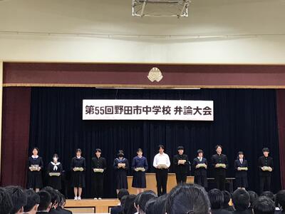 本日、野田市立東部中にて、市内弁論大会が行われました。南部中からは3年3組の藤塚さくらさんが弁士として参加しました。